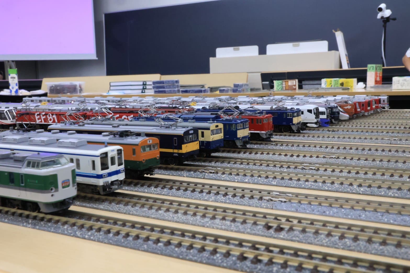 当会では不定期的に大学の広い教室を貸し切って、会員によるNゲージ鉄道模型・プラレールの運転会を開催しています。